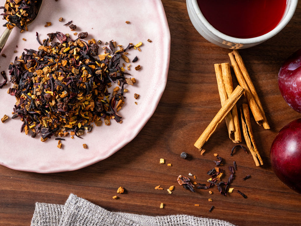 Organic cinnamon, organic hibiscus flowers, organic currants, organic licorice root, natural plum flavor.