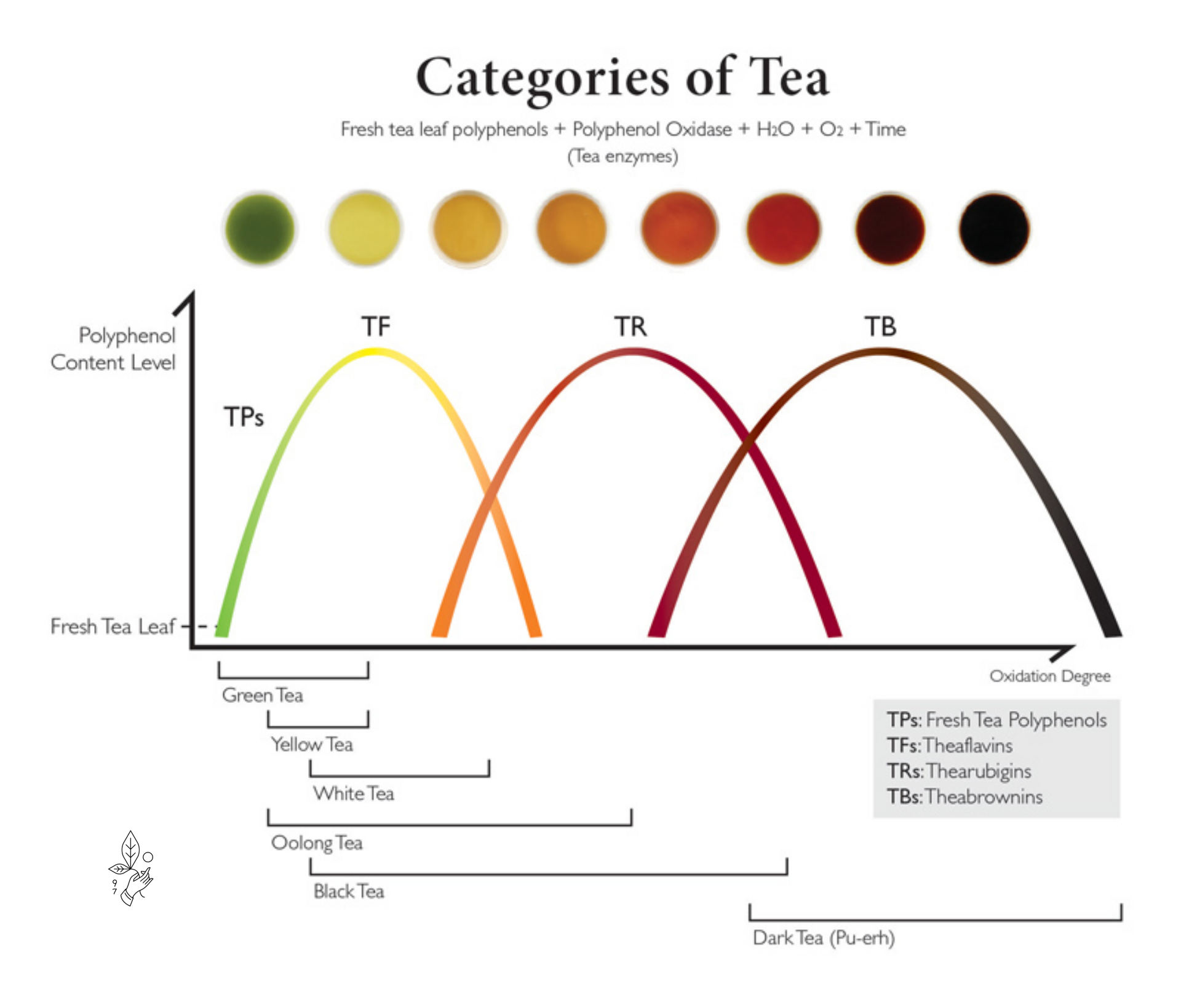 Here we have an outline of the levels of polyphenol types and how we typically see these structures represented in the tea categories. The polyphenols depicted in the chart include: Fresh Tea Polyphenols, Theaflavins, Thearubigins, and Theabrownins. We see on the spectrum, the darker we go, the differently the polyphenols develop. Each class of polyphenols is touted to have different benefits, so hypothetically, one could select a tea with the greater potential for separate healthful gains.